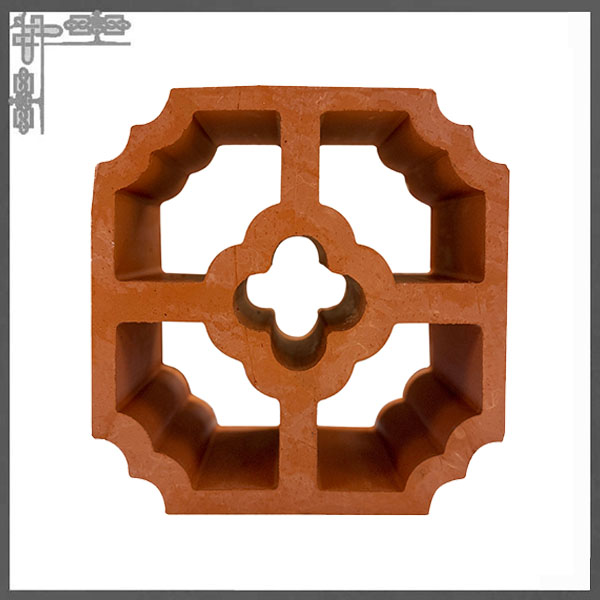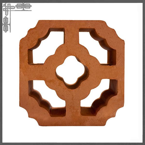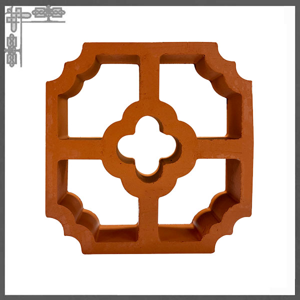 : 这款赤陶花砖以天然陶土为原料,经高温烧制而成,呈现出温润的赤陶色泽与细腻的肌理。其设计融合了传统中式窗棂美学,采用四格对称布局,中心为四叶花形镂空,四角辅以如意云纹装饰,既保留了复古韵味,又不失现代几何秩序感。